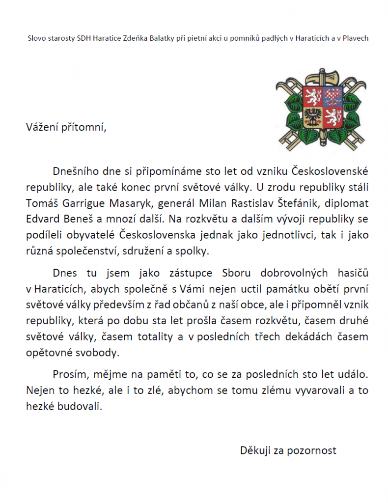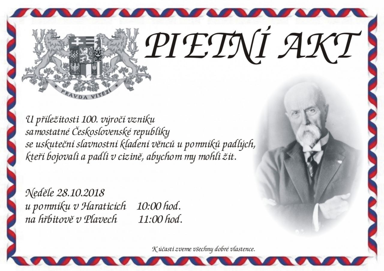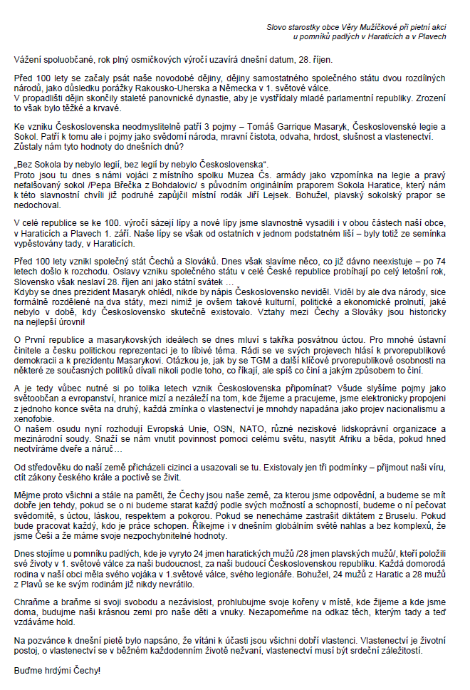 V den 100. výročí vzniku samostatné Československé republiky uspořádalo sdružení O.S.KVH Muzeum Československé armády ve spolupráci s obcí Plavy slavnostní kladení věnců k pomníkům padlých v 1. sv. válce v Haraticích a Plavech.
