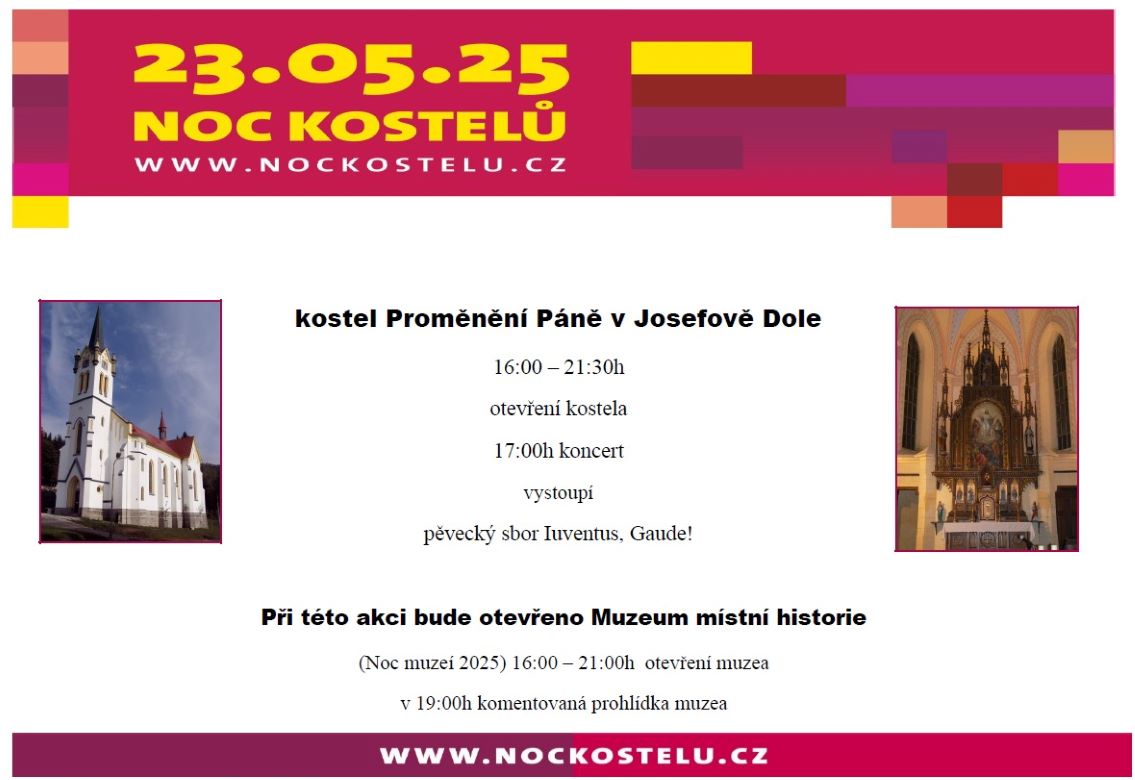 Od 17:00 si užijete koncert pěveckého sboru Iuventus, Gaude!. Muzeum místní historie bude otevřeno od 16:00 do 21:00, s komentovanou prohlídkou v 19:00.