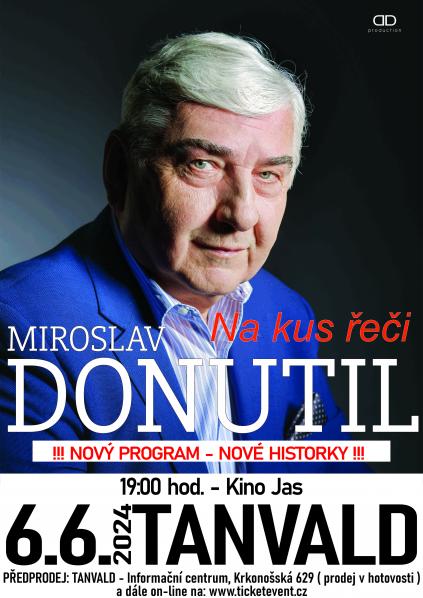 Miroslav Donutil přijede představit jednu ze svých one man show, které mají vždy velký úspěch. Tentokrát to bude nejoblíbenější pořad Na kus řeči - vyprávění zážitků a příběhů z jeho bohatého života a života jeho přátel. Program se skládá z nových humorných příběhů, tak se máte na co těšit.
