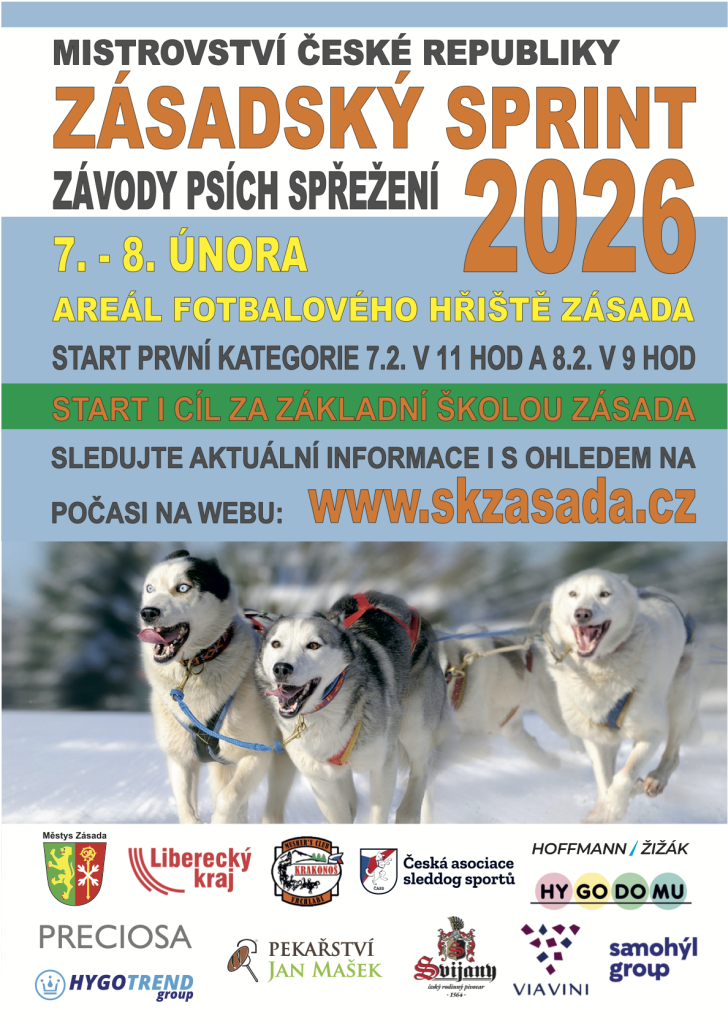 Mistrovství České republiky v závodech psích spřežení, známé jako Zásadský sprint, proběhne ve dnech 7. a 8. února 2026. Akce se koná v areálu fotbalového hřiště v Zásadě. První kategorie závodu odstartuje 7. února v 11:00 a druhý den, 8. února, v 9:00. Nezapomeňte sledovat aktuální informace o závo