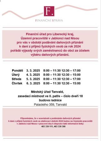 Pracovníci budou přítomni v budově Městského úřadu Tanvald, na adrese Palackého 359 - budova radnice, ve druhém patře, v zasedací místnosti č. 18.