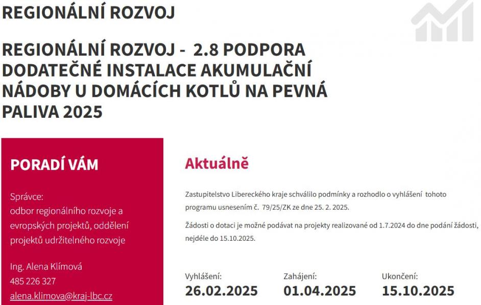 Informujeme Vás o vyhlášení programu č. 2.8 Dotačního fondu Libereckého kraje, oblast podpory regionální rozvoj – Podpora dodatečné instalace akumulační nádoby u domácích kotlů na pevná paliva pro rok 2025. Žádosti o dotace můžete podávat od 1. dubna 2025.